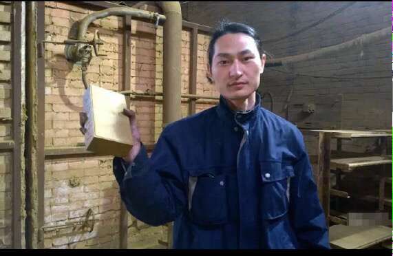 11月30日,河北唐山一家制磚廠內,堅果兄弟在展示一塊用100天的北京霧霾壓制而成的“濕餅”,在經(jīng)過兩至三天的晾曬后,這塊“濕餅”將被標上記號入窯烤制成磚。之后,他計劃將這塊板磚用于北京建筑工地材料。他想以此行動隱喻塵埃對人類生存境況的影響。
