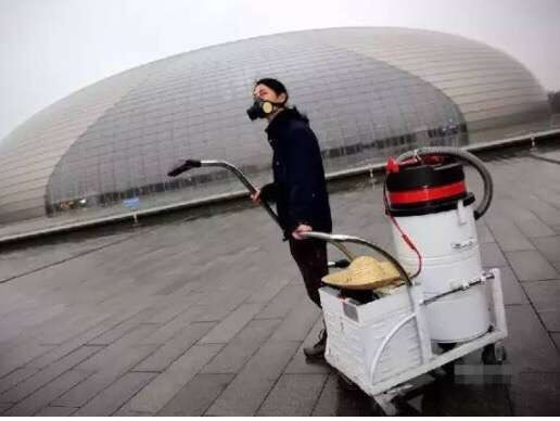 他在此過程中使用的吸塵器是一臺功率1000瓦,流量每小時234立方米,過濾精度0.2微米的工業(yè)吸塵器。該電瓶充電一次后可使用4天時間,粗略相當于62個人一天的呼吸量。圖為11月12日,北京吸霾第84天,堅果兄弟在天安門廣場作業(yè)。當日,京津冀、東北地區(qū)出現(xiàn)大范圍重霾,25個地級及以上城市空氣質量為重度污染。